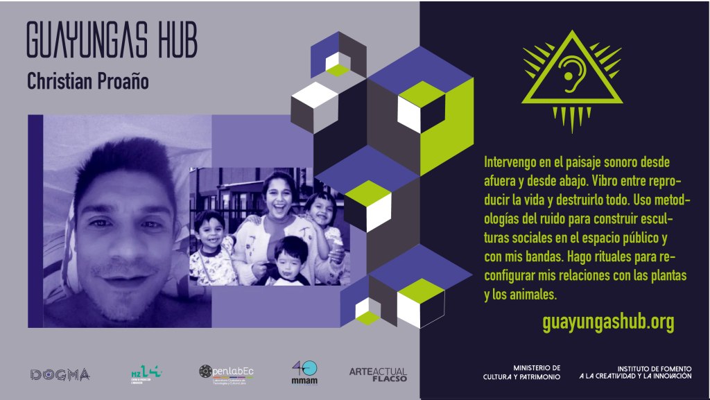 Christian Proaño (1978) es un artista interdisciplinar quiteño. Bachiller en Artes Plásticas por el Colegio de Artes Plásticas de la Universidad Central del Ecuador, en Quito; Licenciado en Artes Sonoras por la Universidad de Middlesex en Londres y Magíster en Antropología Visual por la Flacso en Quito, su práctica transita entre la intervención en el paisaje sonoro y espacio publico, el dibujo y la escultura y el trabajo colaborativo e interactivo. Ha expuesto su trabajo visual en varias galerías y museos del país y del extranjero, ha presentado su trabajo sonoro en festivales y conciertos locales y regionales, y ha editado varios discos independientemente y con Buh Records del Perú. Tiene más de 10 años de experiencia en diseño de sonido para cine documental y radio. Co -fundador de la rED rUIDISTAS del Ecuador, colectivo independiente de intervención aleatoria en el paisaje sonoro que aglutina ruidistas de todo el país; y parte de redce, Red de Compositores del Ecuador, colectivos con los que ha co-gestionado y co-organizado festivales, encuentros, exposiciones y conciertos a nivel local. Tiene 7 años de experiencia en diversos espacios formales e informales de intercambio de saberes artísticos y sonoros con niños, adolescentes, jóvenes y adultos, desde escuelas comunitarias unidocentes a universidades y talleres autónomos. Sus temas de investigación académica y artística son el paisaje sonoro y la construcción social del ruido y el silencio, las nuevas tecnologías enfocadas al arte, y las pedagogías del arte.